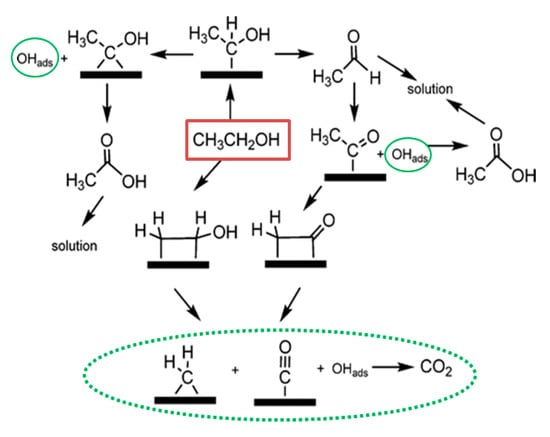 Bioethanol is now practically being used as a blend or fossil petrol substitute. For example, in the USA the use of ethanol as a blended component has increased dramatically from about 1.7 billion gallons in 2001 to about 14.4 billion in 2016 []. However, the “food-versus-fuel” issue is still problematic because ethanol is mostly produced from edible feedstock such as corn. Researchers are therefore, targeting non-edible feedstock including waste from agriculture and forestry and brown macroalgae to produce second generation of bioethanol [,]. This is done by fermentation followed by distillation and drying process. Burning ethanol in the way it has been done with fossil fuel, however, is not the best and “green” way to utilize energy from ethanol. Direct ethanol fuel cells (DEFCs) have been reviewed in detail by Kamarudin et al. and Badwal et al., revealing the current challenges, developments and applications of DEFCs [,]. However, there is lack of information about CBNs’ studies. An effective yet durable catalytic system for ethanol oxidation reaction in PEMFC has been the target of research and could be divided into two different categories. First, the focus was on understanding the catalytic mechanisms; increasing the durability and decreasing the cost of noble-based materials by making alloys such as Sn/SnO2/Pt. One of the main advantages of using these non-noble metal/metal oxide is to create –OH absorption, thus enhancing the removal of COad and other poisonous species out of Pt surface (Figure 7). In some special cases, such as Pt–S–-Rh/C catalysts, it has been reported that C–C cleavage could be achieved, producing CO2 as final product instead of acetic acid [].
