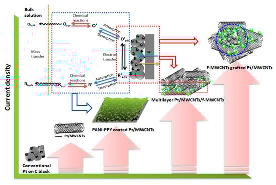 The second and recently explored type of research is the use of CBNs as supporting matrix which can act much less the same as the alloyed systems in terms of detoxification; or be combined with alloyed catalyst to further increase the electrocatalytic activities toward complete ethanol oxidation [,,,,,,,,,,]. Goel and Basu reported a comparative study of CBNs-supported Pt–Ru and revealed that the maximum power density to be in the order Pt–Ru/MCN (mesoporous carbon nitride) > Pt–Ru/t-MWCNTs > Pt–Ru/MWCNTs > Pt–Ru/Vulcan-XC []. The highest power density of 61.1 mW cm−2 at 100 °C, 1 bar pressure with catalyst loading of 2 mg cm−2 using 2 M ethanol feed could be achieved. Our group alternatively fabricated conducting polymers composited with low-loading Pt nanoparticles decorated on functionalized carbon nanotubes (Pt/MWCNTs) and examined catalytic activities toward ethanol oxidation reaction []. In native form, polyaniline (PANI) and polypyrrole (PPY) individually deposited on Pt/MWCNTs exhibited lower catalytic activities over ethanol oxidation than the bare Pt/MWCNTs. However, the co-assembled PANI–PPY deposited on Pt/MWCNTs significantly enhanced both the reaction kinetics and stability of catalysts compared to the one without conducting polymers as revealed by electrochemical measurements. These enhancements were attributed first to the active interface between Pt nanoparticles and conducting polymers, and second to the interaction between PANI and PPY and their contribution to the reaction on Pt surface. Based on the understanding from co-assembled PANI–PPY, it was suggested that the functional groups on polymer backbone may have a crucial effect during the ethanol oxidation reaction. To explore their roles, MWCNTs were used as a highly conductive and chemically inert backbone to attach the desired functional groups. –COOH and –NH2 groups were chosen since both of them could create the dissociative adsorption with water molecules via H-bonding and simultaneously induce charged non-covalent interactions [,]. The results showed that the COOH–MWCNTs supported Pt/MWCNTs enhanced the ethanol oxidation reaction kinetics by about three times more than NH2––MWCNTs and the bare Pt/MWCNTs, in terms of oxidation current density and stability. The results indicated that functional groups functionalized on supporting matrix for catalytic enhancement on Pt active sites play a very important role. In addition, they clearly showed the differences in the effect from specific functional groups depending on their chemical species. We also studied the various structural assemblies between f–MWCNTs and Pt/MWCNTs and how they affected kinetic reactions (Figure 8).