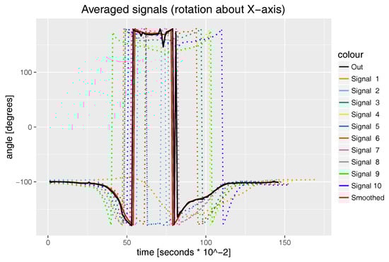 The results of the signal averaging and smoothing algorithm. The plot shows the rotation of hips joint about the Xaxis during mae geri kick with left leg. Dotted plots named Signal 1–Signal 10 are the input data. The solid black line (out) is a result of signal averaging, while the solid red line is the smoothed averaged signal.