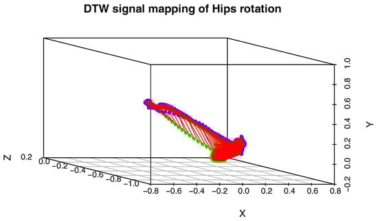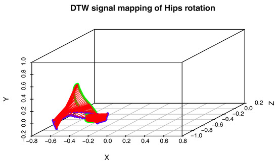 DTW signal mapping of the hips rotation between the template of mae geri kick with the left leg (green signal) and one selected MoCap recording (blue signal) of mawashi geri kick. Those are the same MoCap as in Figure 11. Distances are presented as red sections.