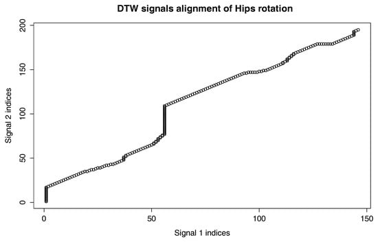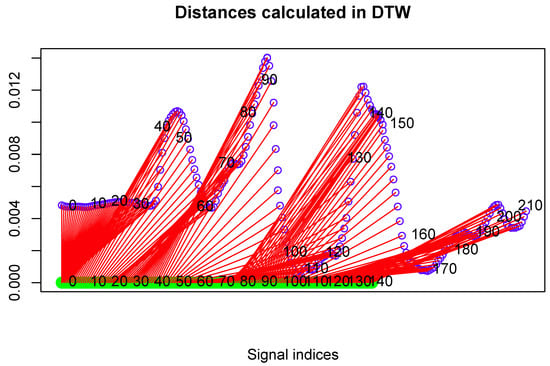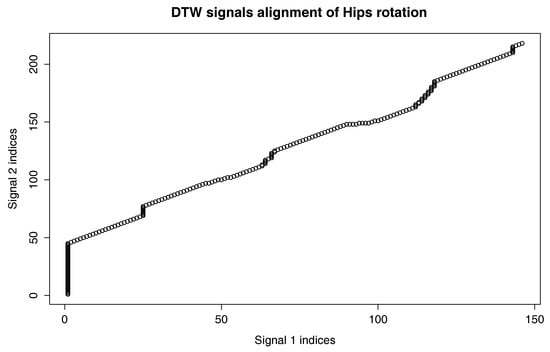 Based on the experiment presented in [28], where the authors evaluated various distance functions in the task of gait identification based on the nearest neighbor classification technique with motion similarity assessment by dynamic time warping, we have chosen Function (1), which gave the best results while using all joints and was the least numerically complicated. Furthermore, visual evaluation of the initial results of application (2)–(4) to DTW done by an expert did not show superiority of any of them over (1).