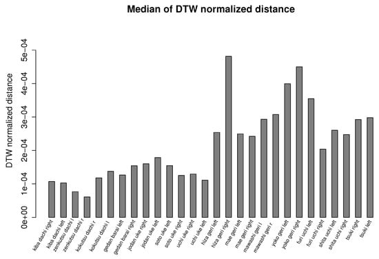 The overall quality of templates measured as the median value of dynamic time warping normalized distances calculated for each karate technique also returns very good (low) results. The median distance for each technique does not overcome the order of (see Figure 6 and Figure 7). In the case of recordings about 2–4 s in length that we are dealing with, this distance means that the differences between MoCap data nearly cannot be spotted by visual observation. Of course, the lengths of MoCap between template and input data might differ; however, we are nearly sure that we generated the same action. This fact was confirmed by our observation. The more detailed results are presented in Figure 8. As can be observed, most of the DTW distances between template and input data have very small values. Most often, the larger distances are in the joint that moves the most; in the case of mae geri, it might be for example the thigh. However, in the case of highly-skilled class athletes, those differences are very low because they have high repeatability of movements.