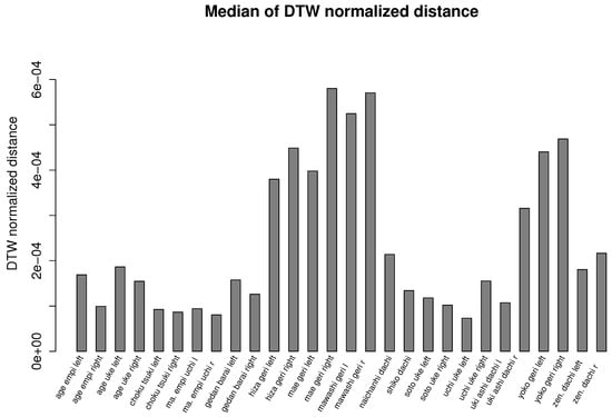 Bar plot of the median value of dynamic time warping normalized distances calculated for each karate technique of the Shorin-ryu karate master. At first, the dynamic time warping normalized distance between template and input signals is calculated, then we take the median value of all calculated distances.