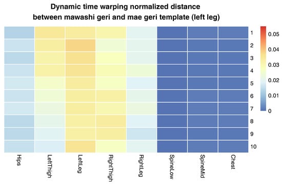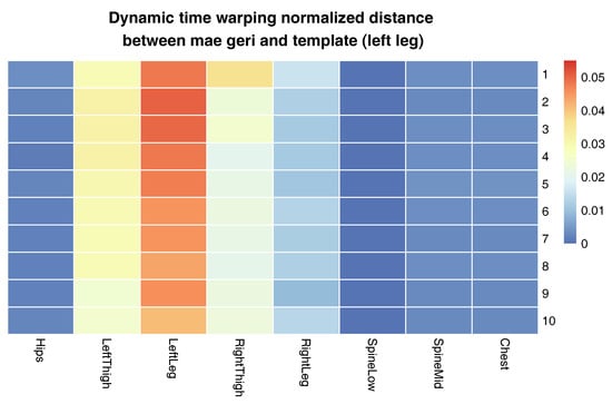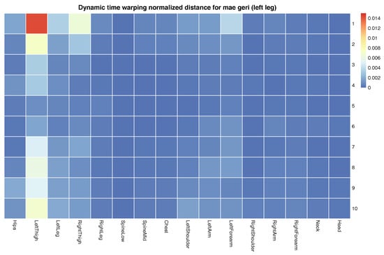 The more detailed results of this evaluation are presented in Figure 8. It shows in the form of a matrix dynamic time warping normalized distances between template and input signals of mae geri front kick with the left leg of the Shorin-ryu karate master. This matrix demonstrates the results of averaging. The bigger the difference is between the particular signal and template, the higher DTWND (dynamic time warping normalized distances) we obtain. The relatively high DTWND values might be present on the map because of two cases. In Figure 8, we see only relatively high differences in left thigh joints in comparison to other joints. This means that movements of the rest of the body are relatively similar between cases, and differences are present because, as we already mentioned, in practice, it is impossible to perform some action ideally; there are always deviations. The highest deviations happened in the joints that required the highest mobility. The second reason for the differences occurs when the matrix visualizes data from two different actions. If one action is a correct template and the other action we want to examine is not, the matrix indicates in which part of the body actions differ the most. The body joints discovered that way should be the target of further analysis, for example by Algorithm 3; we will discuss this case later.