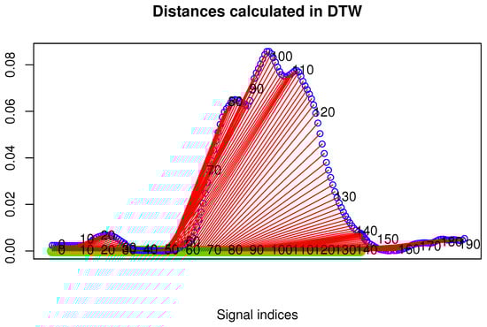 - The second signal is plotted over the first one. It consisted of m sampled points (m is the signal length). The vertical coordinates of each point are proportional to the DTW distance between this point and the corresponding point of the first signal.