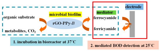 The biosensor for BOD measurement using mediator replaced of oxygen are called mediated BOD biosensor [29]. Ferricyanide was first reported by Pasco et al. [30] for BOD fast detection in 2000, which differs from the standard BOD5 method through a significant reduction in incubation time. The incubation time can be reduced greatly due to the high solubility (~10,000 times more soluble than oxygen), which is attractive for the development of rapid BOD biosensors. The proposed mediated BOD biosensor in this study incorporates the ferricyanide ion as a mediator that acts as an artificial electron acceptor, replacing oxygen as the terminal electron acceptor, in the microbial oxidation of organic substrates. Before measurement, it was taken first that the water sample should be incubated for 15 min at 37 °C with rGO-PPy-B microbial biofilm and ferricyanide mediator in a small bioreactor. During the incubation, the biochemical reaction of microbial oxidation of organic substance conducted as the following equation (1), that ferrocyanide was generated from ferricyanide reduction. Then the incubation solution was centrifuged into electrochemical cell at room temperature of 25 °C for electrochemical detection of ferrocyanide (mediated BOD).The BOD detection mechanism of the proposed mediated BOD biosensor is illustrated with schematic form as shown in Figure 2.