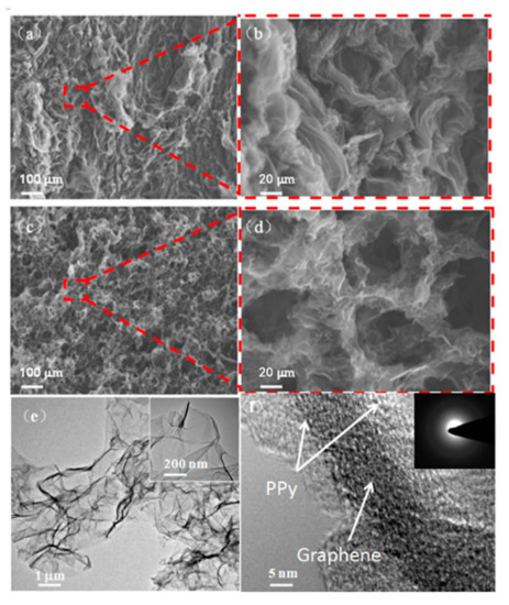 Scanning electron microscopy (SEM) and transmission electron microscopy (TEM) images of the interior microstructures of rGO-PPy composite hydrogels. (a,b) SEM images of the rGO-PPy obtained from Py concentration of 0.1 mM. (c,d) SEM images of the rGO-PPy obtained from Py concentration of 1 mM. (e,f) TEM images of the resulting rGO-PPy. The inset in (e) is the enlarged view of the edge. The inset in (f) is the selected area electron diffraction pattern of (e).