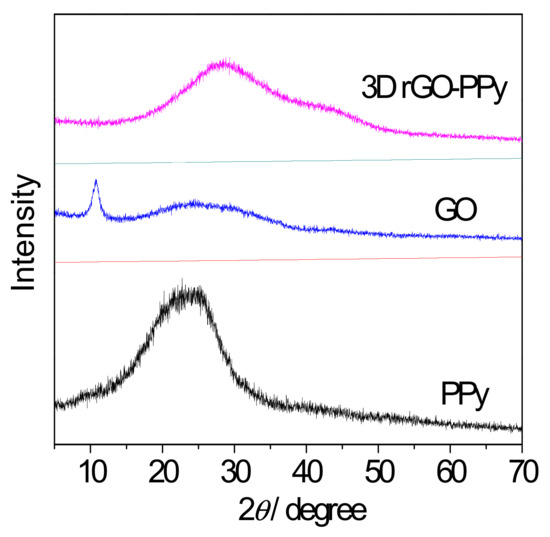 X-ray diffraction (XRD) patterns of PPy, graphene oxide (GO) and 3D rGO-PPy.