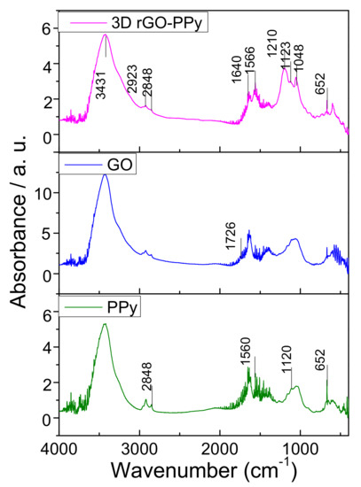 Fourier-transform infrared spectroscopy (FTIR) spectra of PPy, GO and 3D rGO-PPy.