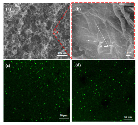 To investigate the possibility of a microbial biofilm, the proposed 3D porous rGO-PPy composite (by adding 1 mM Py) was used for microorganism immobilization via culture in B. subtilis bacteria solution for 24 h. The resulted microbial biofilm of 3D rGO-PPy composite immobilized with B. subtilis was represented as rGO-PPy-B microbial biofilm. Then the as-prepared rGO-PPy-B microbial biofilm was characterized by SEM and CLSM studies. The cross-section SEM images of rGO-PPy-B are shown in Figure 7a,b. It is found that the rGO-PPy-B still presented 3D porous structure after microorganism immobilization, and rod-shaped bacteria can be observed on the surface, which suggests that B. subtilis were successfully immobilized on 3D rGO-PPy composite. Further, the rGO-PPy-B microbial biofilm was stained by acridine orange (AO) for fluorescence imaging. AO is widely used as a marker for distinguishing between dead and living cells [38]. As displayed in Figure 7c,d of the representative CLSM images, the significant green fluorescence were observed at both the surface and the inside of rGO-PPy-B microbial biofilm, indicating that the immobilized B. subtilis were viable and the porous penetration structure was beneficial for more bacteria to be immobilized in the microbial biofilm. So the above results demonstrated that the 3D porous rGO-PPy composite was an ideal supportive substrate for B. subtilis immobilization.