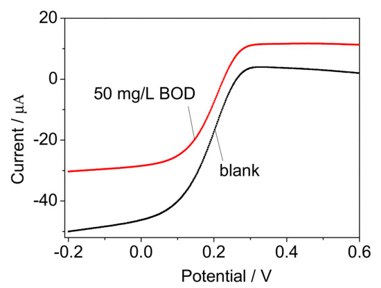 Figure 8 showed the LSV curves for 50 mg/L BOD and blank solution (5 mM PBS and 20 mL ferricyanide, pH 7.0) after 15 min incubation with the prepared rGO-PPy-B microbial biofilm in bioreactor. The added concentration of ferricyanide mediator in water samples and blank solution were both 20 mM. It is found that the amperometric response of 50 mg/L BOD obviously increased compared with the blank solution, suggesting that the rGO-PPy-B microbial biofilm had the effective respiration for biodegradation of organic substance and could be potential for further BOD analysis.