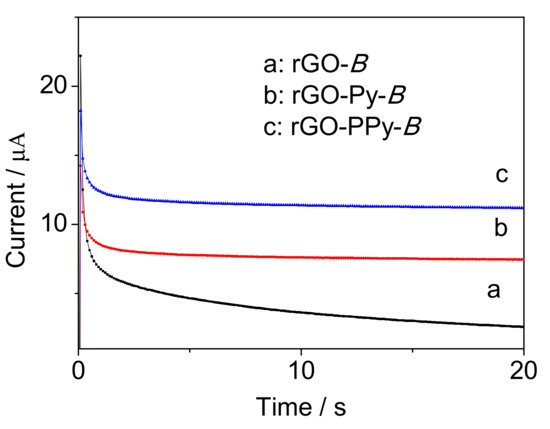 Furthermore, the wet weight method was used to compare the amount of immobilized B. subtilis on rGO, rGO-Py and rGO-PPy. After immobilization under the same condition, rGO-B, rGO-Py-B and rGO-PPy-B were all measured by electronic balance to obtain wet weight. As shown in Table 1, the immobilized cells on rGO-Py are more than on rGO, which further demonstrates that Py can enlarge the pore size of rGO hydrogel and higher loading capability would thus be obtained. Additionally, more cells on rGO-PPy than rGO-Py suggests that positively charged PPy can improve the adsorption capacity for negatively charged B. subtilis cells. Then electrochemical test was carried out by comparing rGO-B, rGO-Py-B and rGO-PPy-B as microbial biofilm in bioreactor for BOD determination with the same concentration of 50 mg/L BOD. As shown in Figure 9, the signal from rGO-PPy-B was 1.5 times higher than rGO-Py-B and 4.2 times higher than rGO-B. This result further demonstrated that rGO-PPy was the most ideal support material for B. subtilis immobilization than rGO and rGO-Py.