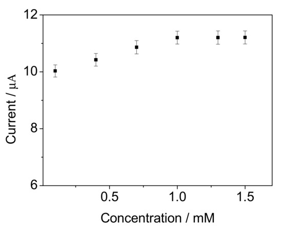 The concentration of Py for 3D rGO-PPy preparation is an important influencing factor for immobilizing B. subtilis because of the adjustable pore size as mentioned above. We know that the amount of immobilized cells would increase as the pore size of 3D rGO-PPy was enlarged. So the BOD electrochemical signals from the rGO-PPy-B microbial biofilms obtained with the Py concentration from 0.1 mM to 1.5 mM were investigated, respectively, by comparing the change of amperometric values (I) before and after 15 min incubation in the bioreactor with 50 mg/L BOD at 35 °C. As shown in Figure 10, I gradually increased as the Py concentration increased from 0.1 mM to 1.0 mM, but had no obvious increase when the Py concentration continued increasing more than 1.0 mM. The reason was speculated to be that the attached Py monomer on the surface and galleries of rGO sheets approached a saturated value when the Py concentration in GO suspension reached up to 1.0 mM. This has implications for two aspects. On one hand, the pore size of resultant rGO hydrogel was enlarged as the Py concentration increased, but maintained without obvious change when the Py concentration increased more than 1.0 mM. On the other hand, when the Py concentration was up to 1.0 mM, the attached Py content on rGO came to a constant value and the electrodeposited PPy layer would keep unchanged during the same electropolymerization time with the continuous increase of Py concentration in GO suspension. Moreover, at 1 mM Py, the obtained 3D porous rGO-PPy has porediametersofabout 20 µm, which is thought to be ideal for B. subtilis cells growth [28]. So 1.0 mM Py is the optimum concentration for 3D porous rGO-PPy preparation to immobilize B. subtilis for the resultant rGO-PPy-B microbial biofilm.