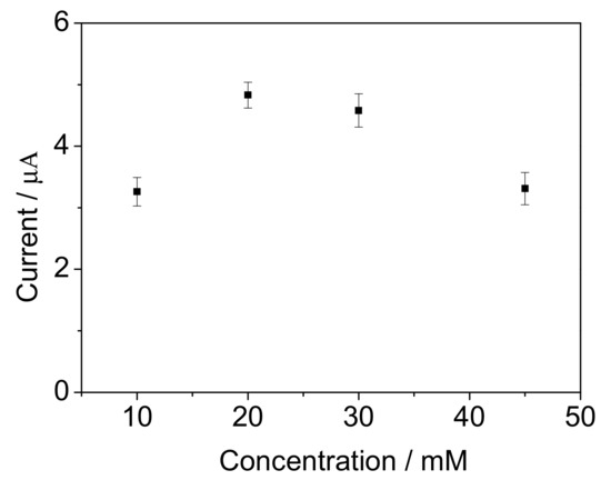 The influence of ferricyanide concentration on the response of the biosensor were evaluated by using 10 mg/L BOD standard solution. Figure 11 shows that the amperometric response reached a high level when the ferricyanide concentration was 20 mM. The response value was obviously reduced when the ferricyanide concentrations were below 10 mM or 45 mM. The reason was speculated to be that the biochemical reaction could be limited by the low concentration of ferricyanide mediator, and the B. subtilis viability was suppressed by the toxicity of the mediator when the ferricyanide concentration was above 45 mM.