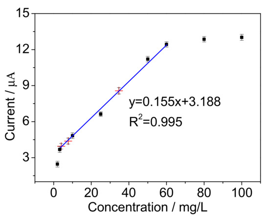 The linear range of the proposed BOD biosensor was further studied. A response range was evaluated with low concentrations of BOD standard solutions from 2 mg/L to 100 mg/L BOD. Figure 12 shows a linear correlation between amperometric responses and BOD concentrations from 4 to 60 mg/L, and the linear regression equation was y = 0.155x + 3.188, where y is current response and x is the concentration of BOD standard solution. The limit of detection as 1.8 mg/L was calculated (S/N ≥ 3). The result revealed that the bacterial degradation efficiency gradually decreased with increasing the organic substrate concentration. The measurement of real water was also carried out using the proposed BOD biosensor. Three real water samples were measured and BOD values of 3.2 mg/L, 7.7 mg/L and 34.7 mg/L (the red intersection points “×” shown in Figure 12) were calculated from their current responses according to the calibration curve. Compared with the third organization data of 4.1 mg/L, 8.6 mg/L and 38.3 mg/L using BOD5 method, the error values of 12.6%, 10.2% and 9.3% for BOD measurement were acceptable. Thus, the experimental results indicate that the proposed BOD biosensor is usable and holds a potential practical application of real water monitoring.