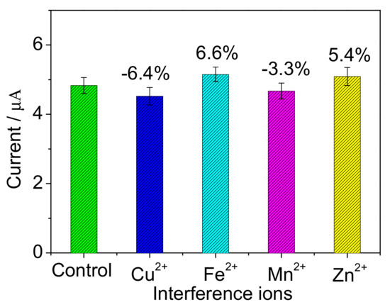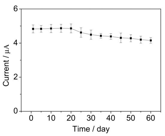 Some heavy metal ions, such as Cu2+, Zn2+, Mn2+ and Fe3+, are common in the surface water and may disturb the biodegradation activity of bacteria cells [39]. Therefore, the influences of these heavy metal ions were investigated. The BOD concentration of 10 mg/L was used as control, and 0.5 mg/L each heavy metal ion was added before measurement. As illustrated in Figure 13, compared with control solution, the response current increased or decreased by less than 10%, respectively. It suggests that the proposed biosensor has good anti-interference ability to the heavy metal ions of Cu2+, Zn2+, Mn2+ and Fe3+. In further, long-term stability of the biosensor was investigated by measuring 10 mg/L BOD. As shown in Figure 14, the signal remained 86% after preservation of the microbial biofilm for 60 d. The signal was enhanced in the first 20 d, which was possibly because the bacteria divided continually and some new bacteria reproduced. In the following days, the signal dropped slowly, the reason of which was surmised that the bacteria stopped growing and the cells came into decline stage.