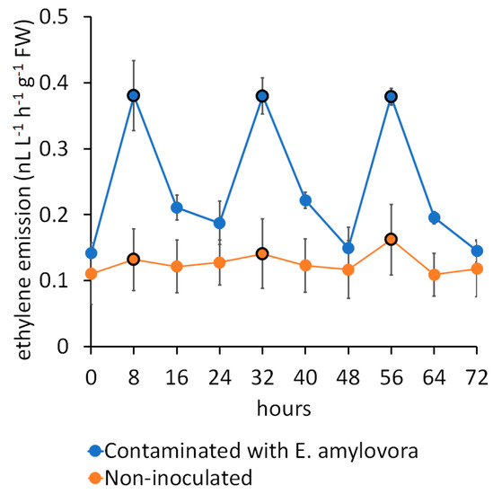 | Erwinia amylovora on apple and pear plants; Botrytis cinerea and Sclerotinia sclerotiorum on kiwi fruit [8,36] | Static headspace analysis RH raised to 100% | EOS835 |