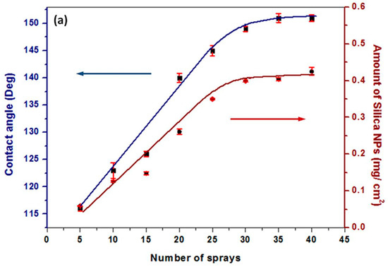 (a) Plot showing the variation of the water contact angle and the amount of silica NPs deposited on the paper versus the number of silica NP sprayings. (b) Contact angle images for samples prepared with 5 to 35 sprays.
