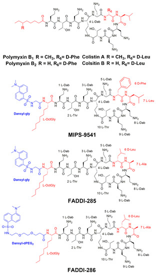Structures of polymyxin B, colistin, MIPS-9541 and the novel fluorescent polymyxin probes FADDI-285 and FADDI-286.