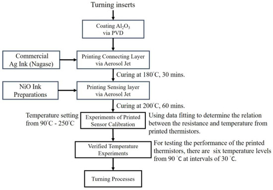 In Figure 1, the research flowchart shows how the printed thermistors were fabricated and confirmed through performance, and then used in real manufacturing and turning processes. In this study, the Aerosol Jet printing process was developed to fabricate miniaturized thermistors with high temperature sensitivity that can be printed directly on tiny cutting tools that are types of turning inserts. Nickel oxide is used as the temperature sensing material for printed thermistors because of its large temperature coefficient of resistance (TCR) and substantial chemical stability [7,12,13,14,15,16].