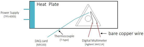 The thermocouple was installed in close proximity to the printed thermistor (Figure 7), and it was found that both the thermocouple and the printed thermistor had the same approximate temperature during the heating process (Figure 8). Both the printed thermistors and thermocouple reacted in less than a second to a temperature change. This proves that the printed thermistor has a high sensitivity and is able to measure temperature changes with great precision.