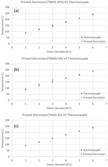 Finally, using Equations (2)–(4), three types of printed thermistors can be compared to commercial thermocouples in verified temperature tests.