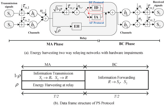 Consider a typical half-duplex two-way relay network that consists of three nodes: two source nodes and with continuously their power sources, and an energy harvesting relay node R, which harvests the energy it needs from the RF signals transmitted by the two source nodes. It is assumed that there are no direct links between the two source nodes due to deep shadowing or blockage; thus information exchange between them only relies on the relay. A PS receiver architecture is employed at the relay as an energy harvester, and hardware impairments that result in distortion noises suffered by all nodes are modeled as shown in Figure 1a.