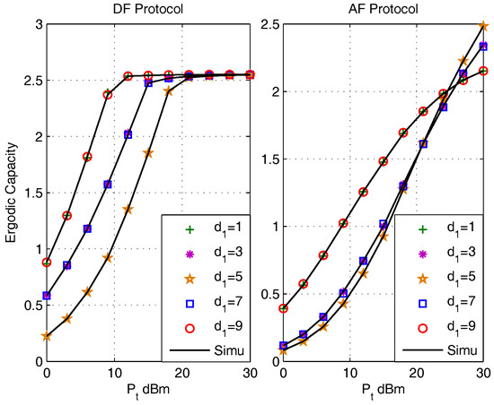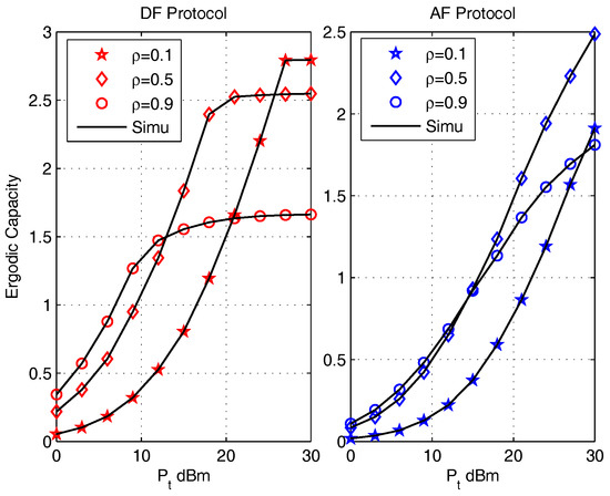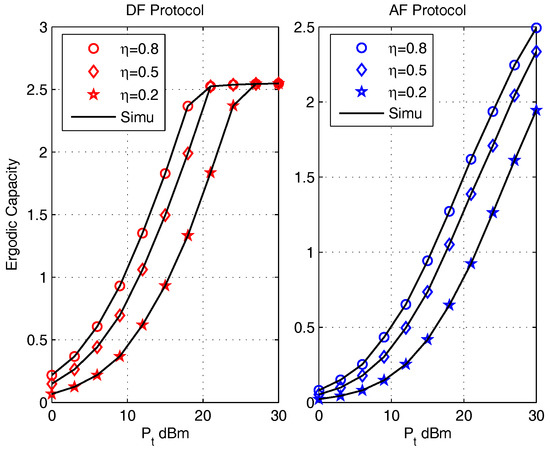The effect of energy efficient conversion ratio on ergodic capacities are presented in Figure 4 for the DF protocol (left) and the AF protocol (right) with parameters , , m, . It can be noticed that the ergodic capacities of both protocols obtained by the closed-form expressions are in accordance with that obtained via Monte Carlo simulations (Simu). With the increase of , it is observed that the ergodic capacity of both protocol increase. This is because increases with the increase of , which will enhance the transmit capabilities of the BC phase. And since is provided by energy harvesting, the value of is usually not very large. Thus the BC transmission ability dominates the value of ergodic capacity. Thus, with the increase of , the ergodic capacities increase. The value of also effects the saturation rate of the DF protocol and the gap between the curves of AF protocol. This phenomenon is due to the value of effects the value of distortion noises.