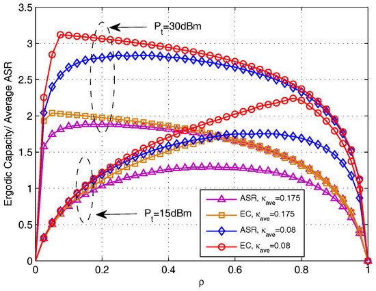 To better understand the importance and the effect of OPS design, we use as x-axis to see the ergodic capacities (EC) and average achievable sum rate (ASR) changes with the increase of . In Figure 6, we present the effect of PS ratio on EC and on average ASR for DF protocol, where the EC is obtained by using the derived closed-form expressions in Section 3.1 and the average ASR is obtained by doing Monte Carlo simulation using (14). It can be notice that, there exists a maximum value for both ergodic capacity and average ASR with the increase of , and the value of that maximize EC and average ASR varies with different transmit power sets and different distortion level sets. The curves of EC and average ASR are not exactly the same, and with the increase of and , the gaps becomes smaller. Though simulation inspect, we find that this is because due to different calculating of EC and average ASR, the correlative influence introduced by multiple-access restraint differs. In addition, with the increase of and , the correlative influence comparatively decreases.