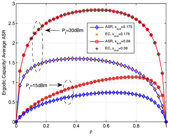 In Figure 7, the EC and average ASR with the increase of for AF protocol are presented. The EC is obtained by using the derived closed-form expressions in Section 3.2 and the average ASR is obtained by doing Monte Carlo simulation using (18). It can be noted that the curves of EC coincide with the curves of average ASR. This is because without the multiple-access constraint influence in AF protocol, the calculation of EC is equal to the calculation of average ASR. In addition, we also find that the transmit power sets and the distortion level effect the OPS value.