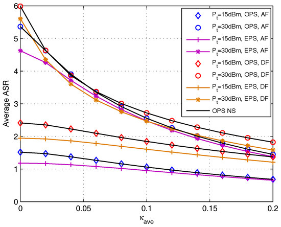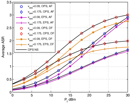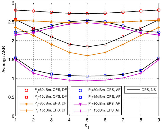 With fixed , we analyze the effect of relay deployment on average ASR with the set of dBm for DF and AF protocols ( is chosen as the x-axis) in Figure 12. This figure verifies that the average ASR with OPS obtained in Section 4 and that obtained by using NS are the same, and the OPS scheme outperform the EPS scheme. For DF protocol, the average ASR is a convex function with the increase of for dBm. While for AF protocol, the average ASR is convex function when dBm, while when dBm, the average ASR is a concave function. This phenomenon echoes the conclusion in Figure 3 (right) that when increase to high enough, the relay is better to deploy close to any one of the source nodes.