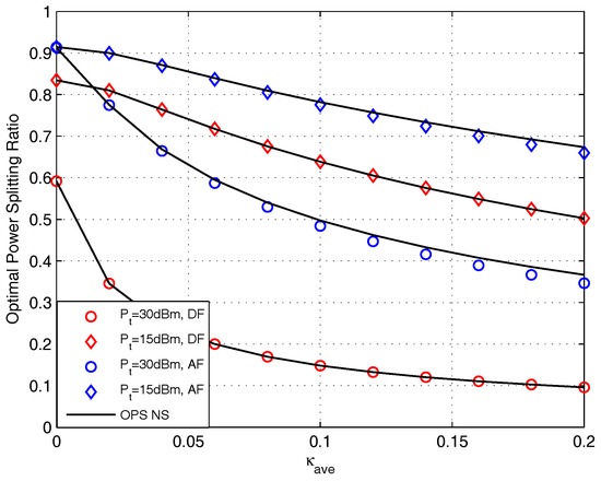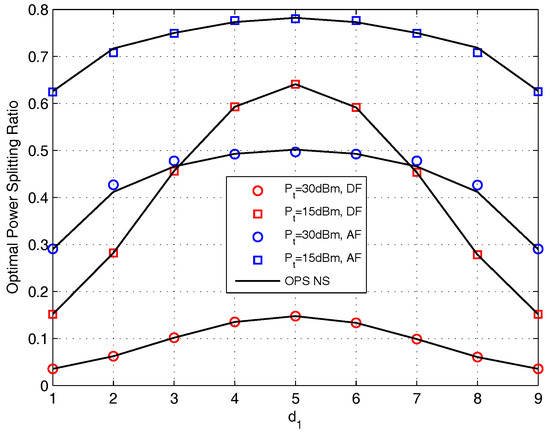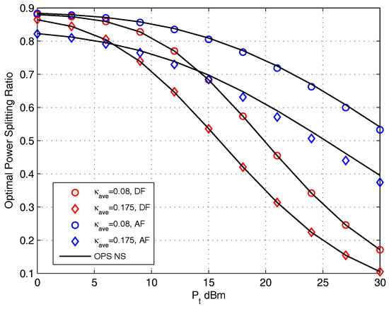 Figure 9 presents the value of OPS ratio versus the transmit power for DF and AF protocols. The setting of distortion level is adopted. Seen from this figure, we find that the OPS ratio obtained by closed-form coincides with that obtained by doing NS for DF protocol, and the OPS ratio obtained by closed-form is quite similar with that obtained by doing NS for AF protocol. It is easy to noted that the OPS ratio is a monotonic decreasing function with the increase of for both protocols. The reason for this phenomenon is because when the source provide high transmit power, the recruit of harvested energy is more prone to satisfy the relay to destination transmission, and the enhancement of system performance is relies on the source to relay transmission which means that more information needed to be split to information decoder circuit, i.e., enhances. We also find that the OPS ratio with setting is higher than that with setting for both protocols. The reason for this phenomenon will be discussed below Figure 11.