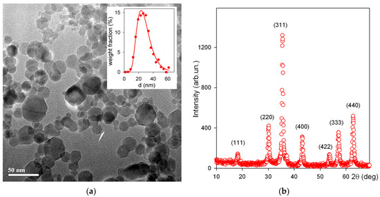The X-ray diffraction (XRD) studies were performed with a DISCOVER D8 diffractometer (Bruker, Billerica, MA, USA) using Cu-Kα radiation (λ = 1.5418 Å), a graphite monochromator and a scintillation detector. The MNPs were mounted on a zero background silicon wafer placed in a sample holder. A fixed divergence and antiscattering slit were used. The quantitative analysis was done using the TOPAS-3 software with Rietveld full-profile refinement [24]. Transmission electron microscopy (TEM) was performed to evaluate themorphology of the MNPs (JEM2100, JEOL, Tokyo, Japan). The specific surface area of MNPs (Ssp) was measured by the low-temperature adsorption of nitrogen (TriStar3000, Micromeritics, Norcross, GA, USA).