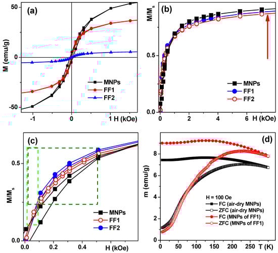 As we have confirmed the possibility of either massive incorporation of LTE MNPs into AMMSCs (FF1) or their adhesion toward the cell membrane (HBMLs, AMMSCs for FF2) one can discuss the possibility of their magnetic filed assisted application. To make the comparison easier let us re-calculate M/Ms hysteresis loops for Ms—being a saturation magnetization for each particular case (Figure 3). Figure 3a shows that the saturation magnetization of air-dry MNPs is the highest one and Ms for FF2 MNPs is the lowest as one could expect taking into account the fabrication process and inevitable separation step resulted in the removal of large MNPs. At the same time in low field interval below 1 kOe, which is most reasonable for applications, one can observe that FF1 and FF2 MNPs reach the higher moment comparing with air-dry in the same low field. This is clear advantage for such application as magnetic biosensing (magnetic fields below 100 Oe [12]). The second interval for possible applications (100–500 Oe) is connected to idea of the cell use as native microcapsules for targeted delivery in a supplement of nanomedicine and theranostics, cell technologies, and regenerative medicine [41,42,43].