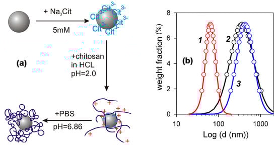 (a)—Scheme of encapsulation of iron oxide MNPs by chitosan. (b)—PSD (obtained by DLS) in suspensions at different steps of the encapsulation: 1—suspension FF1 of MNPs in 5 mM citrate—solution of chitosan taken for encapsulation—suspension FF2 of encapsulated MNPs.