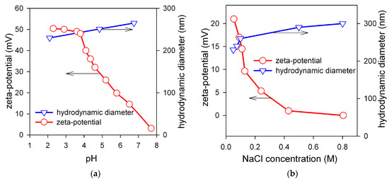 (a)—pH dependence of the zeta-potential and of the mean hydrodynamic diameter of aggregates in the suspension FF2 of the encapsulated iron oxide MNPs. (b)—Dependence of the zeta-potential and of the mean hydrodynamic diameter of aggregates in the FF2 suspension of the encapsulated MNPs at pH = 6.5.