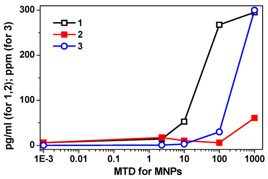 Dispersing LTE iron oxide MNPs in a chitosan matrix changed the type of the dose-response curve for the secretion of biological molecules by HBMLs culture. Figure 5 shows the summary of these results: curve 1 (corresponding to the FF1 suspension without chitosan) was well fitted by exponent y = 2.13e1.06x, R2 = 0.96; curve 2 (corresponding to the FF2 suspension with chitosan) was well fitted by 3-degree polynomial dependence with a high degree of approximation: y = 6.5x3 + 51.9x2 + 124.1x − 73, R2 = 0.99 and curve 3 showing correlation between calculated dependence of iron concentration in MTDs and in parts per million (ppm) was well fitted by exponent y = 0.0119e1.9785x, R2 = 0.99, wherein, the value of 2.3 MTDs of MNPs with chitosan statistically increased the concentrations of all tested cytokines, compared to both levels—the baseline level and the corresponding dose of MNPs without chitosan (Table 3).