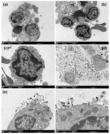 TEM of HBMLs mononuclear blood leukocytes. (a)—control culture grown without MNPs. HBMLs mononuclear blood leukocytes after 24-h contact with MNPs of suspension of iron oxide MNPs without chitosan (FF1) at a dose of 100 MTDs: (b)—magnification ×7100, (c)—magnification ×14,000. HBMLs after 24-h contact with MNPs of suspension of iron oxide MNPs with chitosan (FF2) at a dose of 100 MTDs, magnifications: (d)—×7100, (e)—×18000, (f)—×36000.