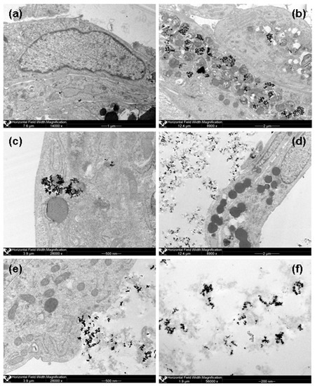 TEM of human mesenchymal stem cells. (a)—control AMMSCs culture grown without MNPs. AMMSCs cells after 24-h contact with MNPs of suspension of iron oxide MNPs without chitosan (FF1) at a dose of 100 MTDs: (b)—magnification ×8900, (c)—magnification ×28,000. AMMSCs cells after 24-h contact with iron oxide MNPs of suspension with chitosan (FF2) at a dose of 100 MTDs: (d)—magnification ×8900, (e)—magnification ×28,000. Aggregates of LTE MNPs encapsulated by chitozan (f)—magnification ×56,000.
