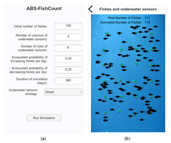 User interface (UI) of ABS-FishCount (an agent-based simulator of underwater sensors for measuring the amount of fishes). (a) input screen; (b) output screen.