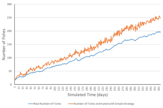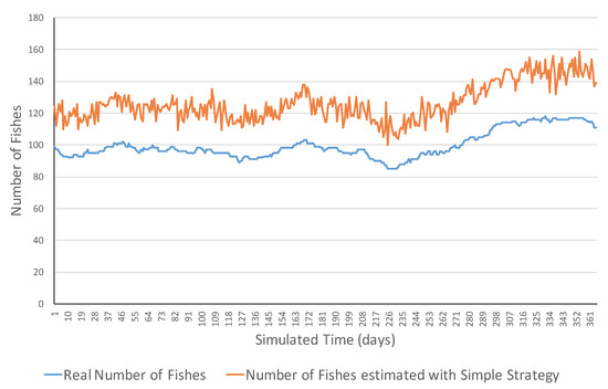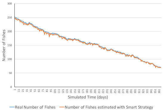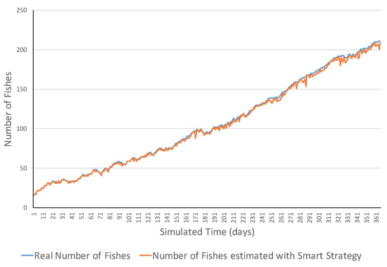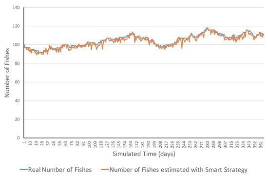 Figure 4 presents an example of an increasing ecosystem. This ecosystem showed realistic variations in the short term including both increasing and decreasing ones. However, in the long term, the number of fish increased from 15 fish to 195 fish. The MSE error was 1075.31 and errors ranged in the [2, 62] interval. Figure 5 shows a simulation example of the same ecosystem but using a smart strategy. One can observe that the estimations were much closer to the real values. This was also reflected in the much lower MSE (i.e., 6.77 fish), and all the errors belonged to the [0, 13] interval.