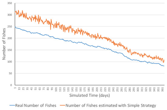 Figure 6 shows the evolution of a decreasing ecosystem with the simple strategy in the measurement of fish, while Figure 7 presents a simulation example of the same ecosystem type with the smart strategy. The results of this ecosystem were very similar to the previous ones. The smart strategy obtained lower errors than the simple strategy (MSE of 2188.99 compared to 10.60). The difference of this ecosystem type was that the real number of fish decreased from 250 to, respectively, 82 and 72 fish. Notice that this approach uses the TABSAOND technique with the nondeterministic decisions, and the final results may slightly vary from one execution to another with the same input parameters.