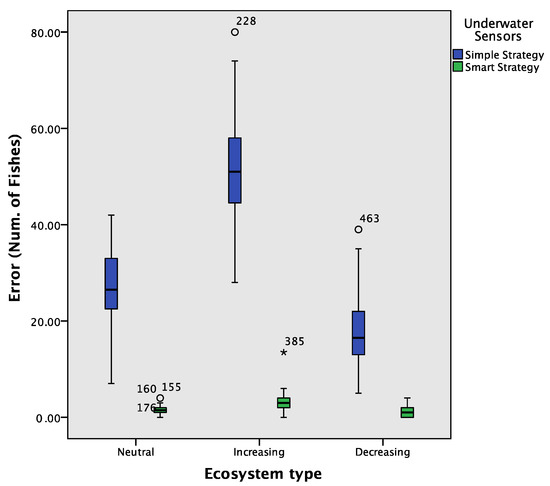 Comparison of errors with a boxplot considering the results of 100 simulations for each ecosystem and each underwater sensors strategy.