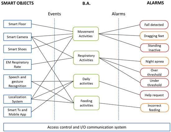 Figure 1. HDOMO logic architecture: 7 different SOs, based on multiple sensors, process data at low level to perform 4 different Behaviour Analyses (B.A.), which are processed at high level in the cloud infrastructure and are able to generate 8 different alarms on two levels: level 1 (critical alarm—red) and level 2 (non critical alarm—orange).