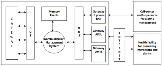 Figure 3 represents the communication system composed of three main blocks that together manage alarms, interactions and communications towards the outside. SOs responsible for the detection of dangerous events are considered by the communication system as alarm signals and therefore have the highest priority compared to all other types of reports. In the analysis of the management of alarm signals dangerous events have been identified as most probable and most important: