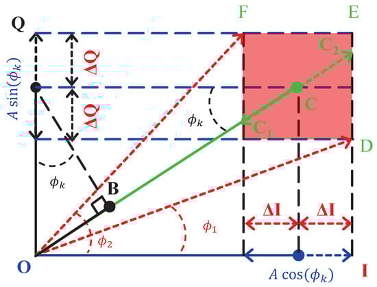 Principle of the determination of R. Abscissae represents the in phase component , and ordinate represents the quadrature component , where and are Gaussian noise terms. is an observation of A in conventional dual-phase LIA method. Let and be the uncertainty in I and Q, caused by and . and are the observed phase delays of the input noisy signal. The red area describes the uncertainties using traditional dual-phase LIA. In this article we consider the following observation of A. In this case the area of uncertainties is a line between and . This area of uncertainties is smaller than in the classical case and it shows that the proposed observation is more accurate than R.