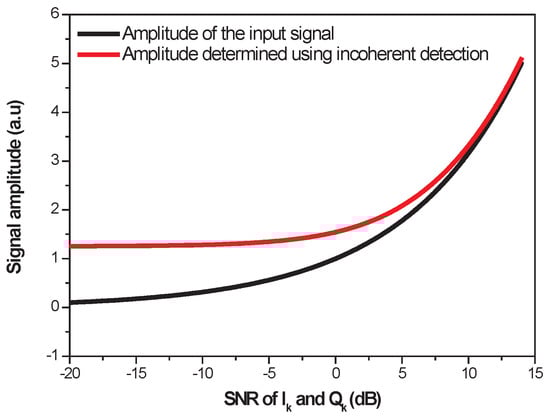 We show in Figure 3 the mean value of A obtained with observations of . The x-axis is the SNR of the components and . The black line shows the values of the input signal amplitude A. The black line is also the mean value of A obtained with the CD method for a Gaussian noise on the observations. The red line represents the mean value of A obtained with the ID method for a Rician noise on the observations. These curves show that the ID method (incoherent detection) is biased in case of weak signal detection, especially when the SNR of the and components is less than 5 dB. These results are obtained for a Rician probability distribution given by the following equation:
