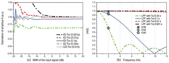 (a) Estimates of the input signal amplitude A as a function of the signal-to-noise ratio (SNR). Assessment of coherent detection (CD) and incoherent detection (ID) methods for different : 0.001 s, 0.01 s, 0.1 s and 0.25 s; (b) Frequency response of the Low-Pass Filters (LPF) with of 0.001 s, 0.01 s, 0.1 s and 0.25 s.