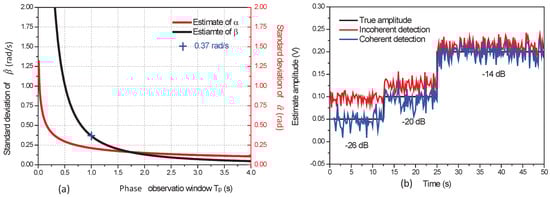 (a) Standard deviation of and for a SNR of dB; (b) Example of LIA detection using coherent and incoherent detections.