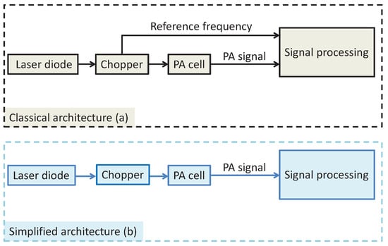Figure 6a describes a classical LIA architecture of a PAS sensor. A laser beam, modulated with a mechanic chopper at a “reference frequency”, is used to probe absorption of NO. The reference frequency is then used to demodulate the signal with a traditional lock in amplifier. The photoacoustic (PA) cell is a single-pass cylinder which has a length of 26 mm and a diameter of 6 mm []. The proposed LIA architecture is described in Figure 6b. The proposed approach uses a fix frequency and no tracking of the reference frequency is necessary.